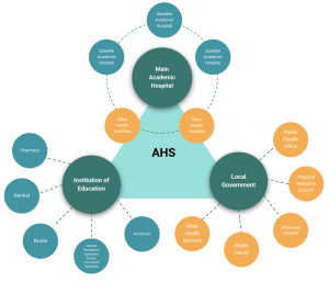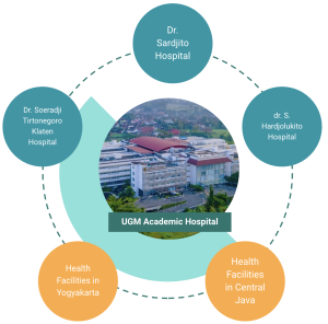 The Faculty of Medicine at UGM collaborated with 3 hospitals to develop the AHS: the Dr. Sardjito General Hospital, the Dr. Soeradji Tirtonegoro Hospital, and the S. Hardjolukito Hospital, while also establishing our very own UGM Academic Hospital to strengthen our teaching hospital network. We have also integrated with other health systems and healthcare service organizations across the Special Region of Yogyakarta (DIY) and Central Java Province.