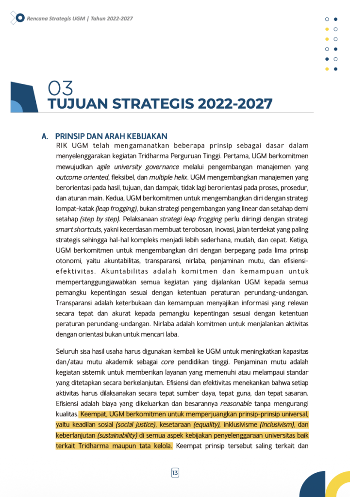 Page 13 states: “…UGM is committed to upholding universal principles—namely social justice, equality, inclusivism, and sustainability—in all aspects of its institutional policies, both in relation to the Tridharma and to university governance.”
