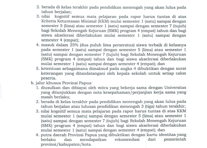 The admission policy is also aligned with the previous admission policy in Rector’s Regulation Number 11 Year 2019 Article 9 which stated the accessibility of higher education for prospective students from the Papua region.