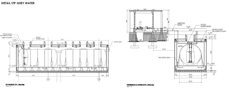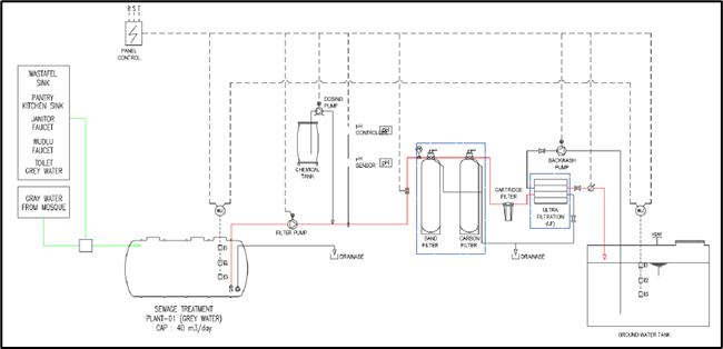 The picture below shows the Schematic of The Sewage Treatment Plant (STP) or Biological Treatment Process for Greywater (left) and Schematic of the Water Treatment Process for Greywater (left). Several faculties, including the Faculty of Engineering, have implemented a greywater recycling system.